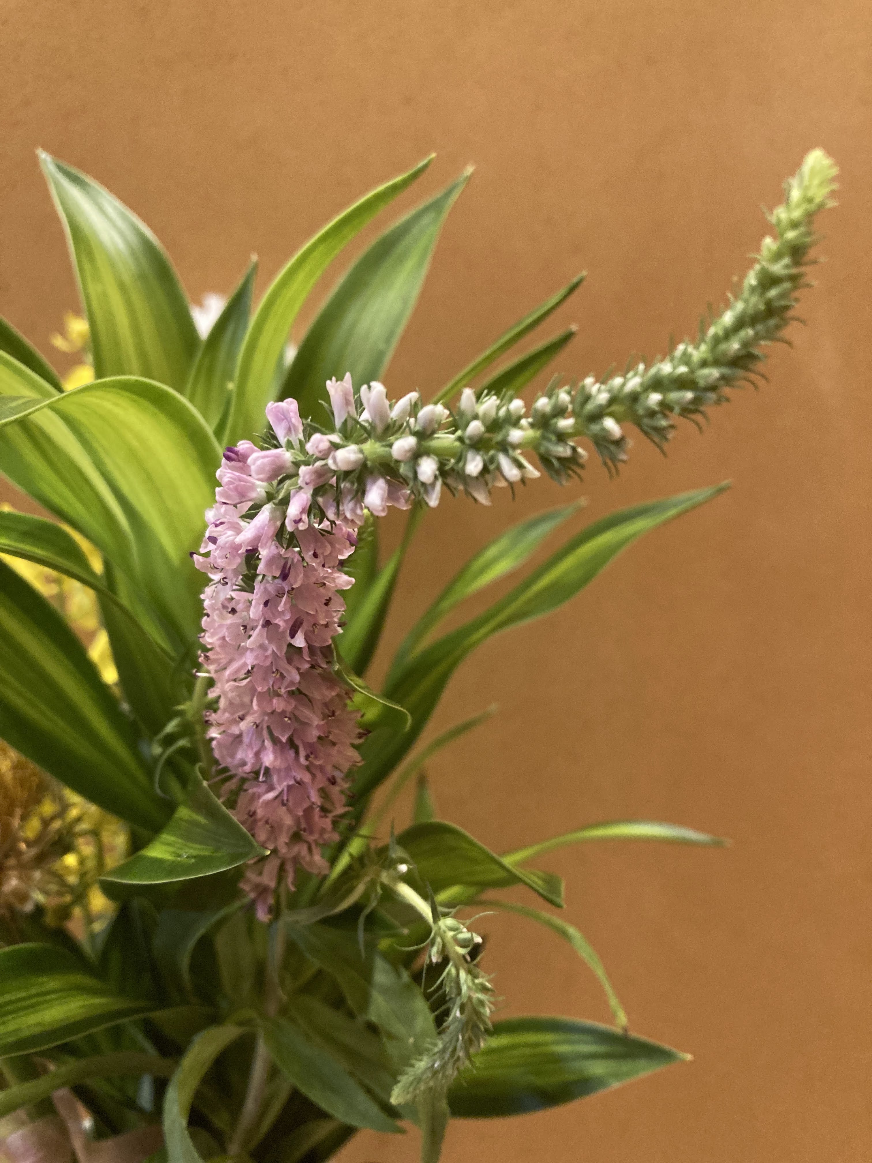 Oncidium/dancing lady orchid, Texas blue bell, calla lily, dryandra formosa, Cooktown orchid, Veronica/speedwell, and dracaena.